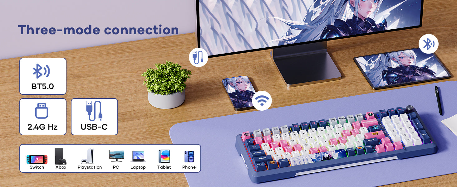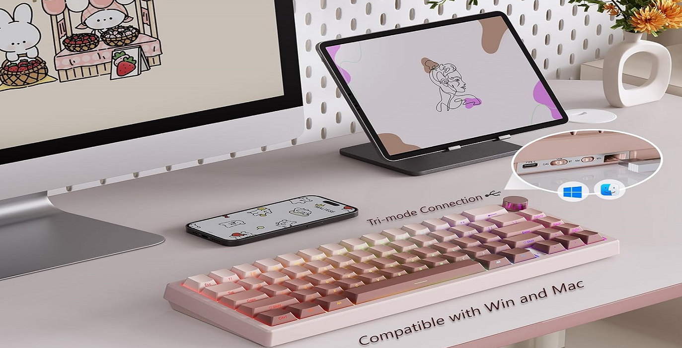 66 Keys Compact Design, 60% Wireless Mechanical Keyboard, 2.4G/USB-C/Bluetooth Gaming Keyboard